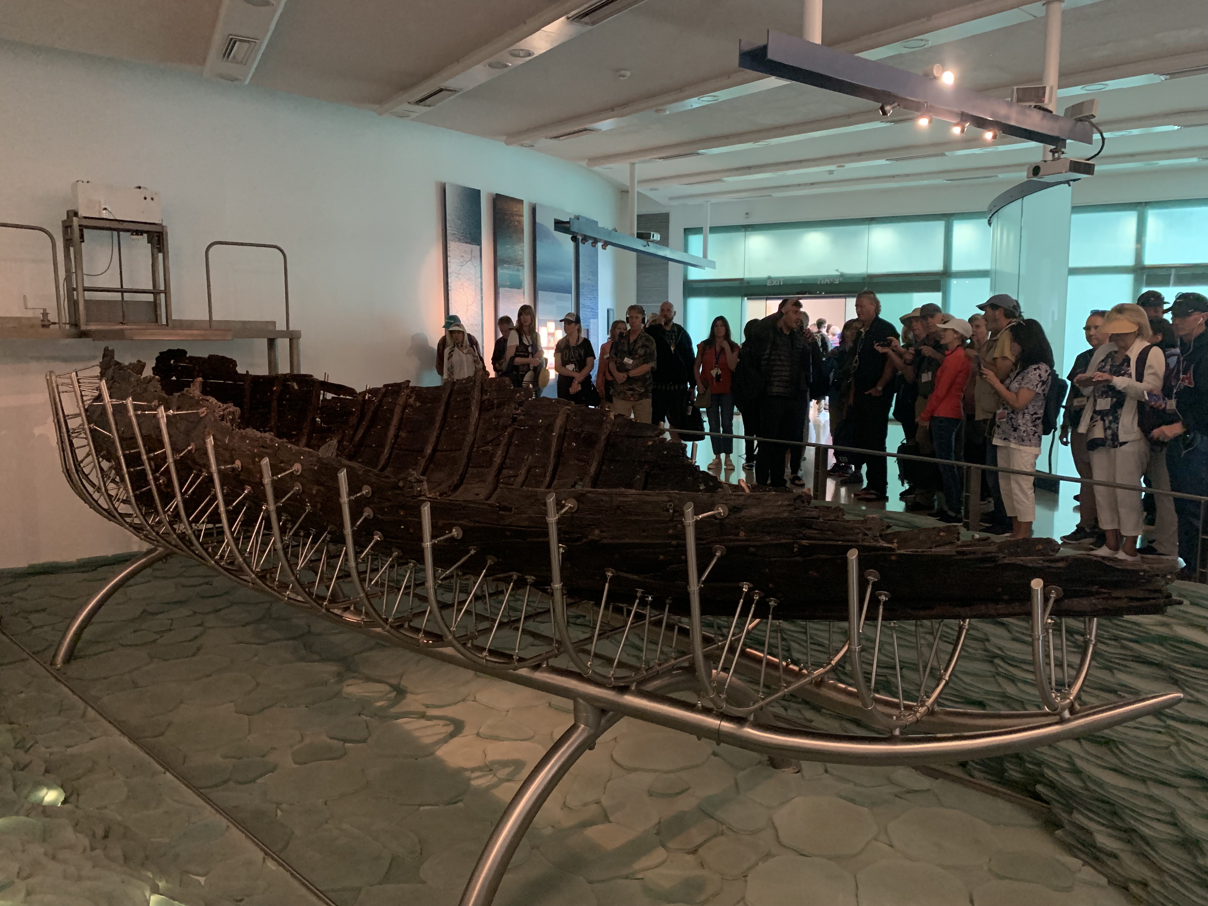 As we slowly put-putted north we are afforded time to quietly contemplate the magnitude of the place we are experiencing. I see a couple of water birds but not much else except placid green water. We dock and depart at the north end of the lake and enter the “Jesus Boat” museum. Apparently, as the Sea pulled back from its shores during a drought some time ago, a two thousand year old fishing boat was revealed, [add comma] surprisingly well preserved in the mud. Archeologist entombed it in foam, removed it, preserved it, and build a small museum around it. As an example of how such boats were constructed back then, it is extremely valuable, and for that, it is worth the walk through. However, it is a one item exhibit. We traverse the ever present snack bar and shop as we return to our awaiting buses.